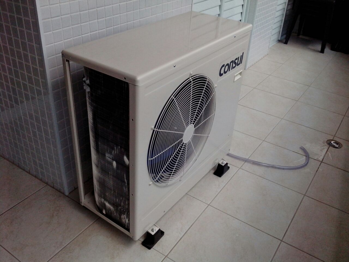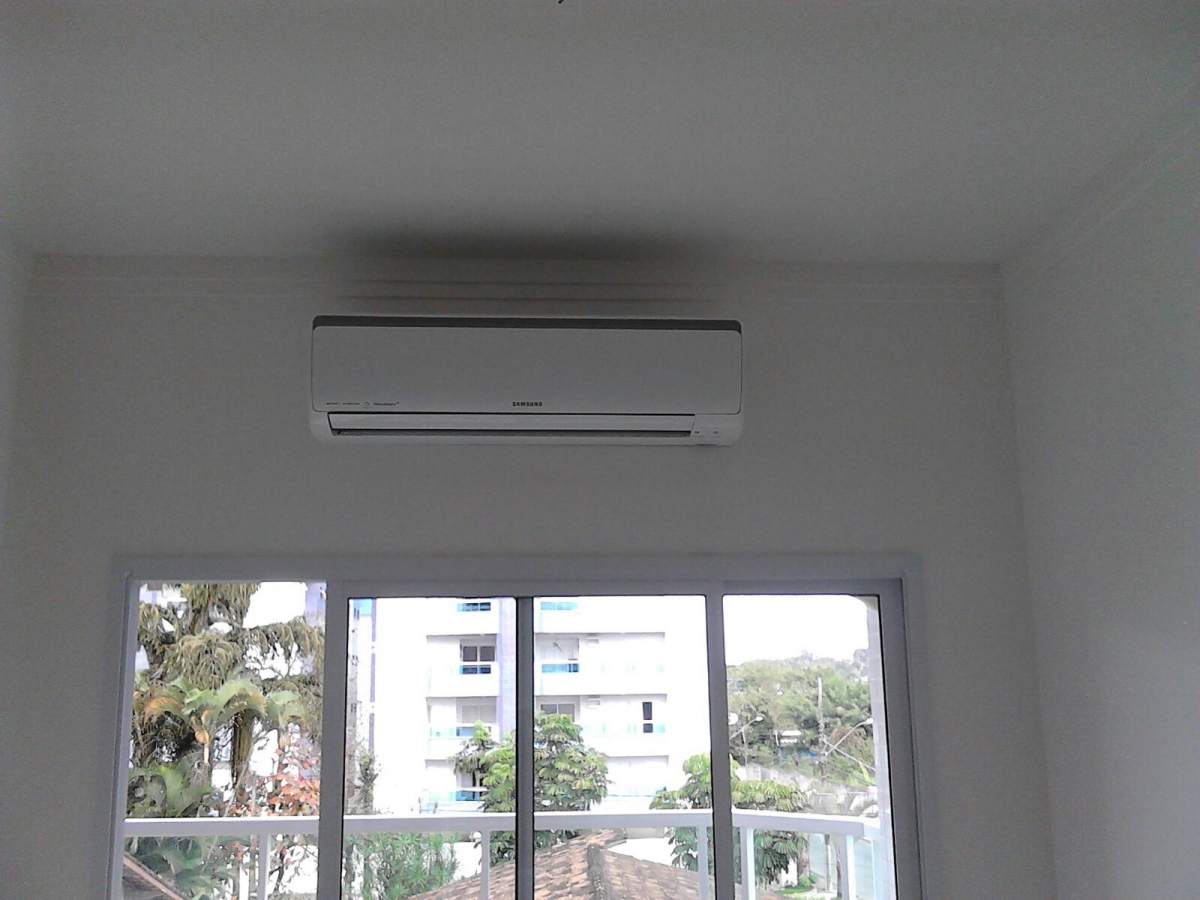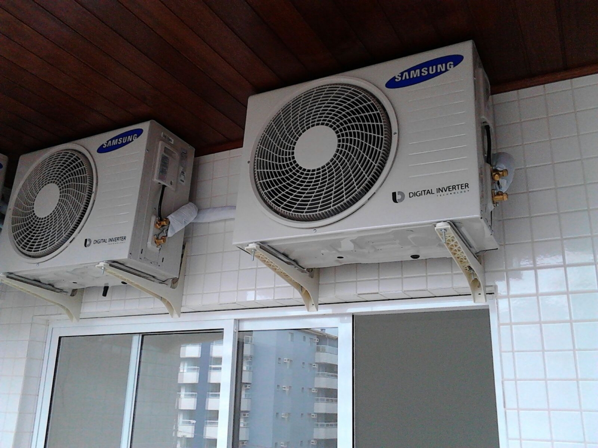 Instalação com as unidades condensadoras na sacada do apartamento logo acima da porta balcão que dá acesso à sacada. Instalação de drenagem externa pela sacada até um ralo para escoamento da mesma.