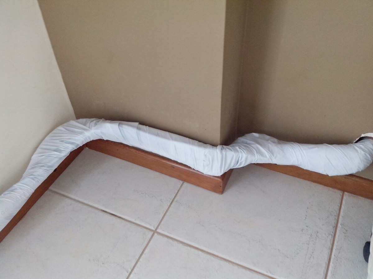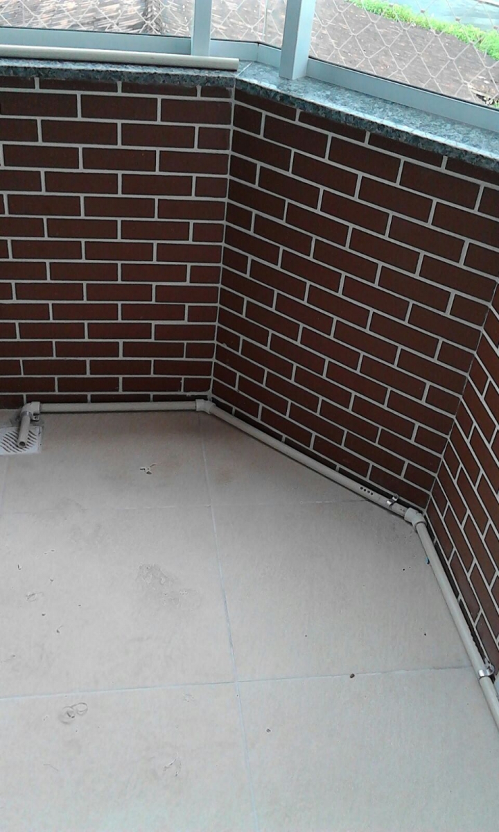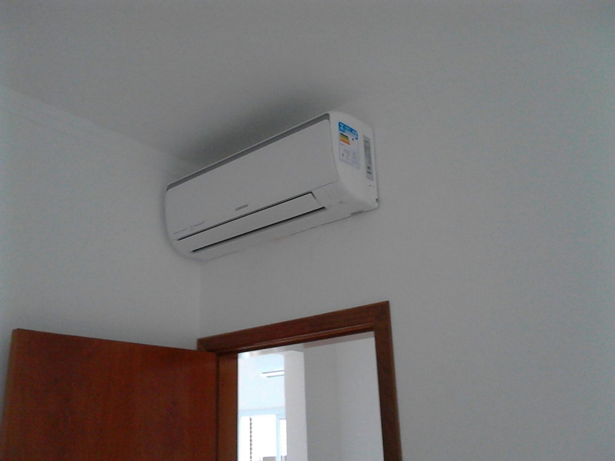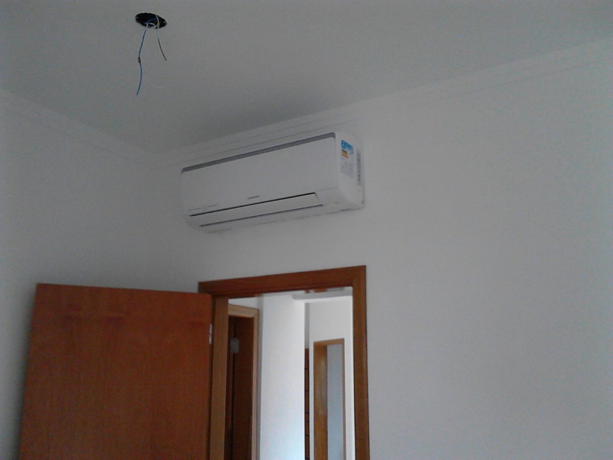 Instalação com as unidades condensadoras na sacada do apartamento logo acima da porta balcão que dá acesso à sacada. Instalação de drenagem externa pela sacada até um ralo para escoamento da mesma.